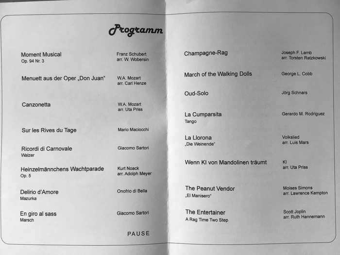Konzert mit Verleihung der PRO MUSICA-Plakette am 2.6.18 um 15:30 im Kulturpunkt West (Das Programm umfasste Werke vom Gründungsjahr des Mandolinenvereins bis heute: Unterstützt wurde das Konzert von den Musikern und Musikerinnen des befreundeten Mandolinenclubs „Concordia“ aus Königslutter. Auch die vor kurzem gegründete Kindergruppe des Vereins hatte sich mit einem ersten Stück vorgestellt.)